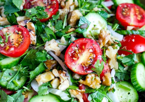 You want to find the delicate taste of this famous salad with tomato and cucumber dressed with walnut that you can find everywhere in Georgia ? Well, you're at the right place ! Easy and quick, here is a simple way to recreate this delicious salad also named "Salati Nigvzit" in Georgia :